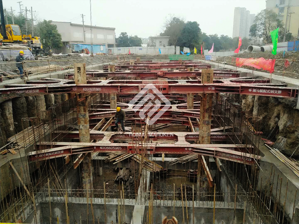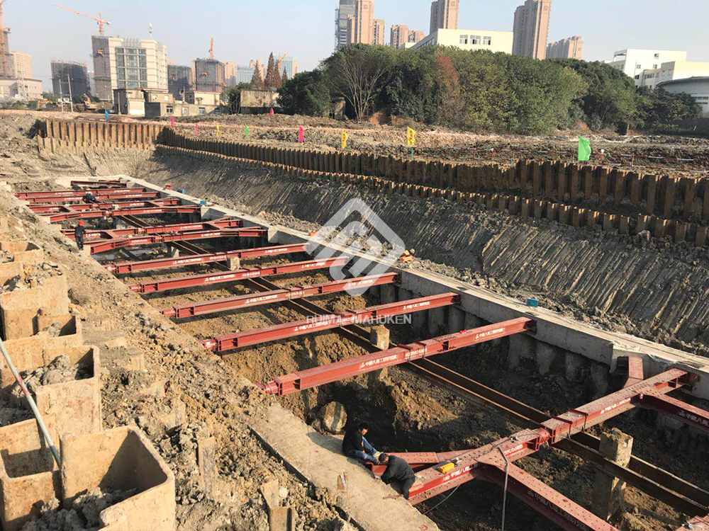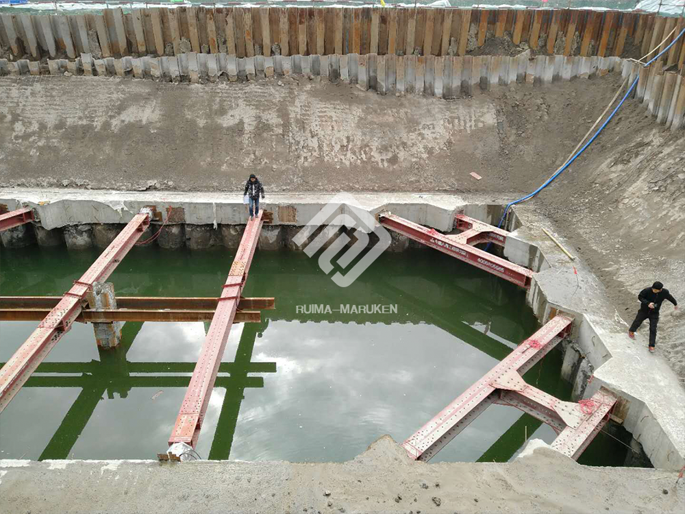 該項目基坑呈矩形,面積約為4800平方米,深度為6米,為組合使用角撐、對撐的一個全鋼基坑支護(hù)方式,總用鋼量為145噸。