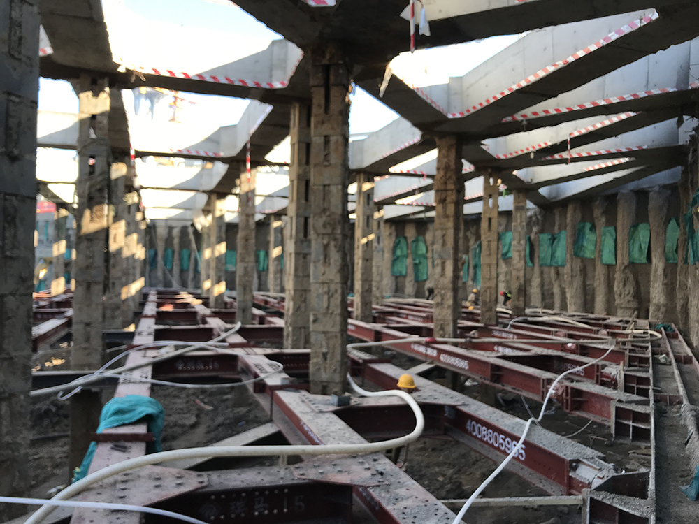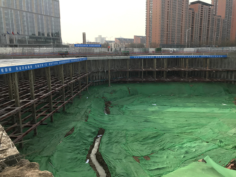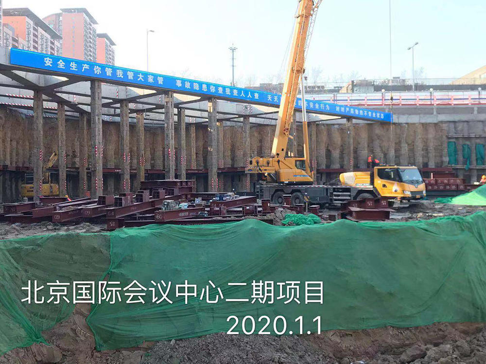 國家會議中心二期配套項目之B23地塊位于北京市奧林匹克公園南側(cè)(大屯路以北、大屯北路以南、天辰西路以西、北辰西路以東區(qū)域)。項目建設(shè)單位為北京北辰會展投資有限公司,總包單位為中國建筑第二工程局有限公司,由北京中巖大地科技股份有限公司進行支護設(shè)計?;悠矫鏂|西長約100m,南北寬約245m,面積約24500平米,平均開挖深度為20m,局部開挖深度21m,部分通道出口開挖深度15m,西側(cè)地塊內(nèi)道路開挖深度0.2~7m。本工程基坑采用錨桿+裝配式型鋼支撐組合支護方式。其中裝配式鋼支撐位于基坑南側(cè),其第一層為鋼筋混凝土支撐,第二、三層為裝配式鋼支撐,鋼支撐端部與基坑邊設(shè)置鋼圍檁固定。鋼支撐通過下部鋼托梁支承,鋼托梁采用H300*300型鋼,連接于鋼支撐施工區(qū)域內(nèi)格構(gòu)柱上。裝配式鋼支撐用鋼量約為800.00噸。因基坑周邊有隧道環(huán)線以及北方冬季氣溫較低,對基坑位移及變形控制要求較高,故采用4套(48頭液壓千斤頂)全自動伺服系統(tǒng)進行軸力實時控制,實測最大變形量僅15mm。