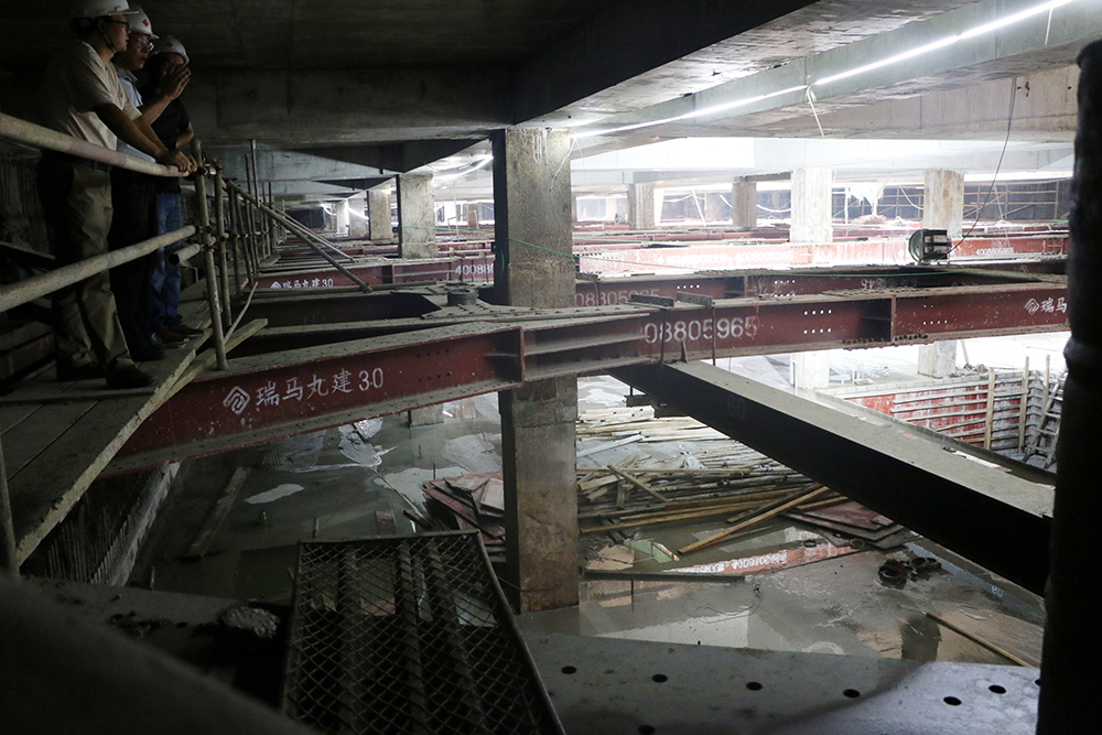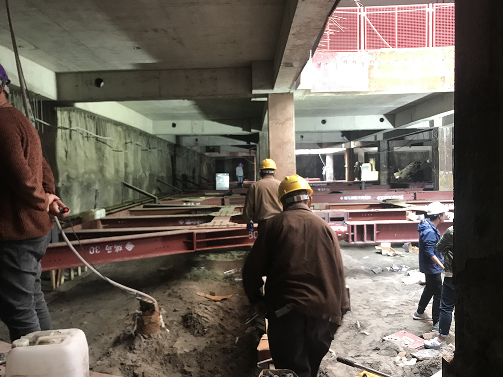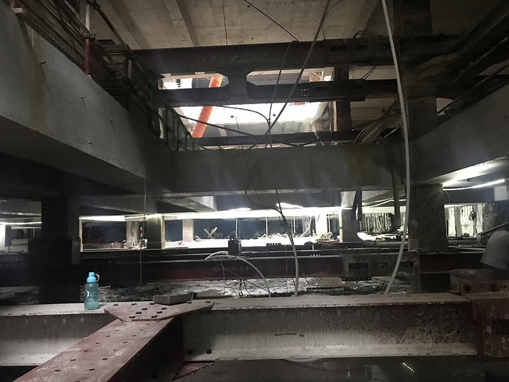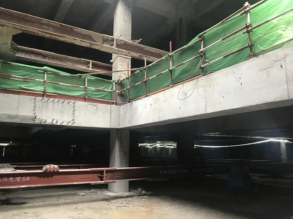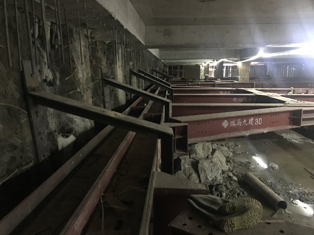 項(xiàng)目用地面積約5000平方米地下(2層),圍護(hù)結(jié)構(gòu)采用砼灌注樁+三層砼內(nèi)支撐+兩層鋼支撐,型鋼支撐每層的布置形式為2組角撐和5道對(duì)撐組成,鋼支撐總量600噸。安裝工期20天。替代砼內(nèi)支撐200m3。該項(xiàng)目是國(guó)內(nèi)首個(gè)地下空間逆作法施工的裝配式型鋼支撐工程,在層高不足2.4米的地下密閉空間里安裝600噸型鋼支撐,對(duì)施工的組織、協(xié)調(diào)和機(jī)械配合有著極大的挑戰(zhàn)。每層支撐安裝工期在10天,大大節(jié)約了施工工期。后期也經(jīng)歷了基坑淹沒(méi)等事故,型鋼支撐的安全性、可靠性得到了驗(yàn)證,受到甲方的高度認(rèn)可。