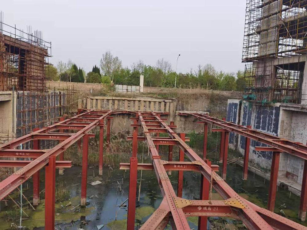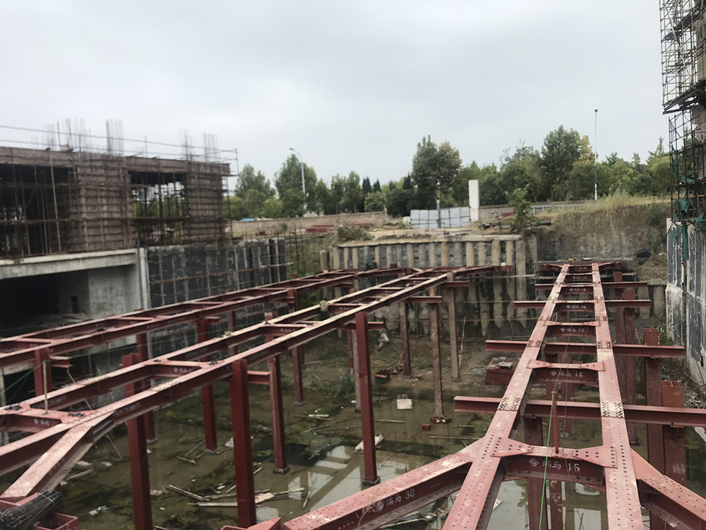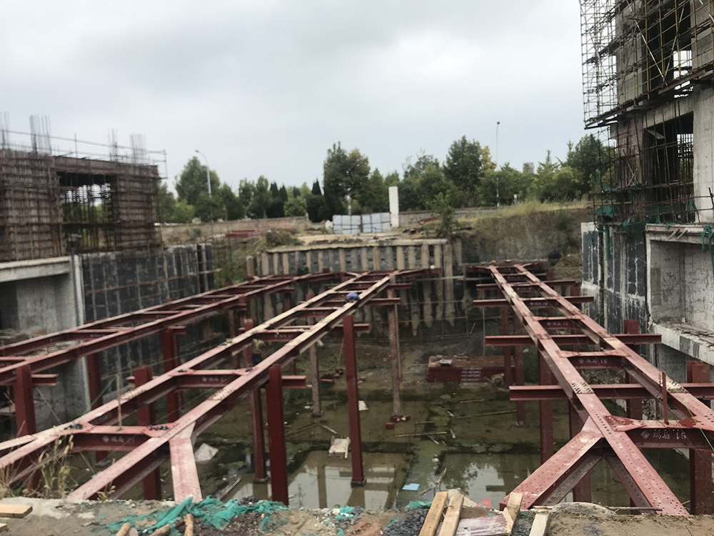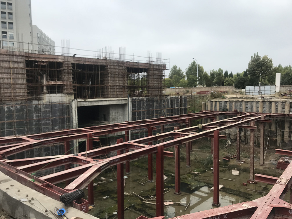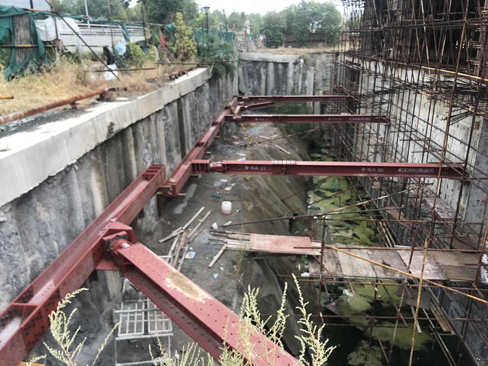 本項(xiàng)目位于安徽省淮北市相山區(qū),南鄰人民路,西鄰溫哥華二期,東靠人民路與龍山路交叉口中心廣場(chǎng)。項(xiàng)目建設(shè)單位為淮北新華書店有限公司,由安徽省城建設(shè)計(jì)研究總院股份有限公司設(shè)計(jì)?;用娣e約10886m2,基坑已開挖深度11.5m。設(shè)計(jì)采用裝配式鋼結(jié)構(gòu)支撐加固基坑,現(xiàn)場(chǎng)新增混凝土支撐結(jié)構(gòu)作為鋼支撐的支撐點(diǎn),總用鋼量155.64噸。整體工期30天。本工程針對(duì)淮北國(guó)金大廈現(xiàn)有基坑支護(hù)進(jìn)行加固,是裝配式H型鋼支撐體系首次在基坑搶險(xiǎn)加固領(lǐng)域的應(yīng)用。截止2021年6月歷經(jīng)18個(gè)月,鋼支撐狀況依舊良好(設(shè)計(jì)使用年限1年)。