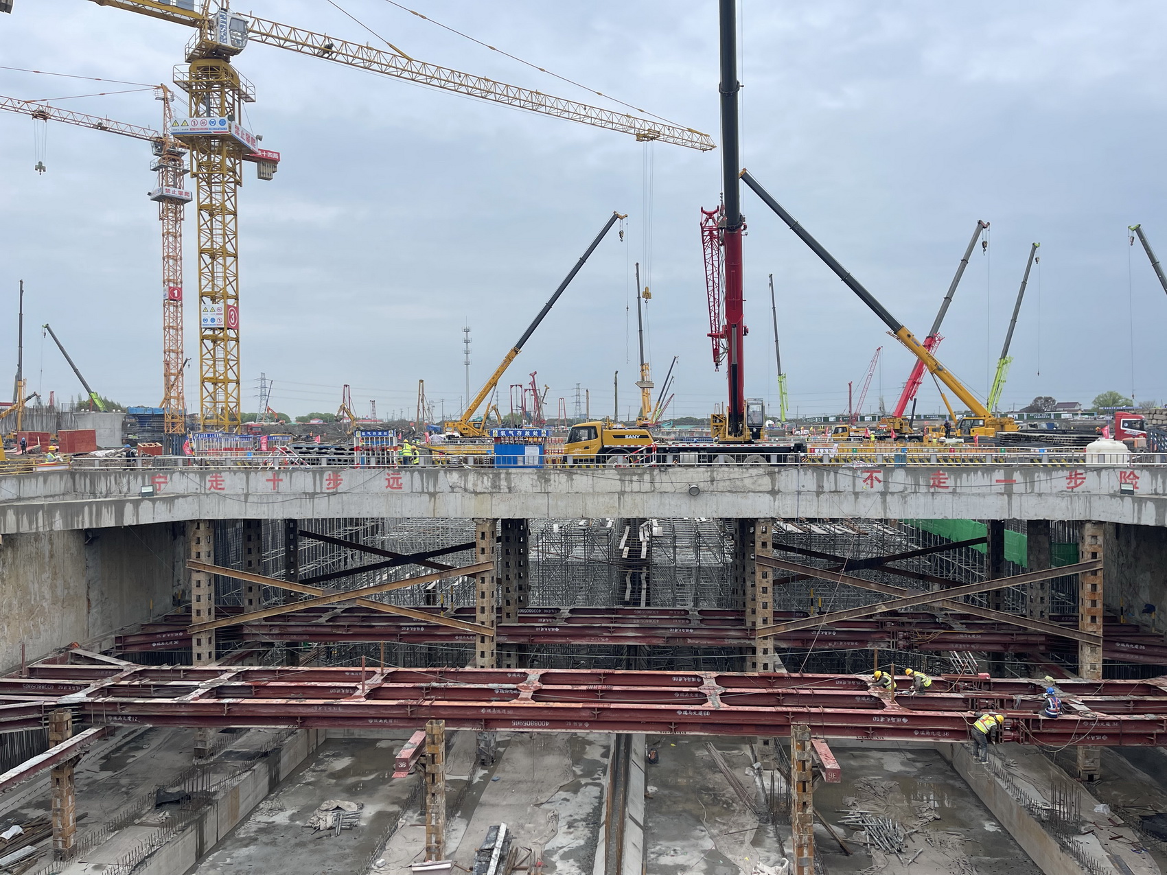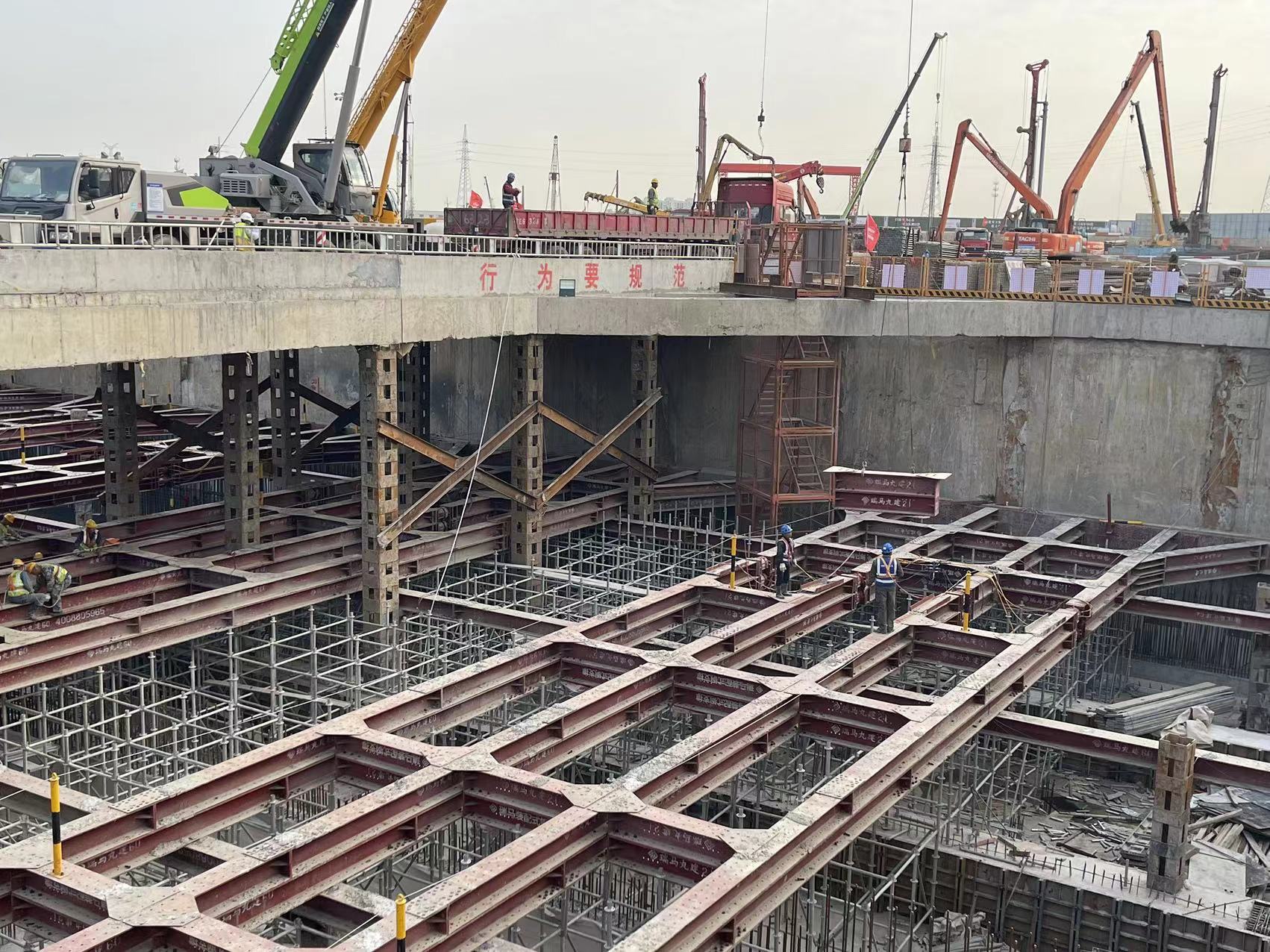 本項(xiàng)目為地下兩層雙島式車站,基坑標(biāo)準(zhǔn)段寬度為45.5m,底板埋深約16.5m(現(xiàn)狀地面標(biāo)高約為2.0m),局部承臺(tái)深度約18.5m。車站主體圍護(hù)結(jié)構(gòu)采用放坡+地下連續(xù)墻結(jié)合內(nèi)支撐,明挖順作法施工。原狀地面標(biāo)高2米,三級(jí)放坡放坡后場(chǎng)地標(biāo)高-1.22米寬度10米,基坑邊采用200mm厚擋墻,冠梁采用1000x1000,第一道混凝土支撐(800x1000),冠梁及第一道混凝土均在-1.22米標(biāo)高,第二道鋼支撐(H400x400上下疊拼)標(biāo)高-8.77米,第一道混凝土支撐和第二道鋼支撐公用格構(gòu)柱,基坑承臺(tái)底部標(biāo)高-16.27米,底部承臺(tái)墊層為250厚C25早強(qiáng)混凝土墊層。裝配式型鋼支撐、型鋼圍檁:型號(hào)為H400x400x13x21型鋼,鋼支撐下裝配式托梁型號(hào)為H400x400x13x21型鋼,采用上下疊拼形式,材質(zhì)均為Q355B。