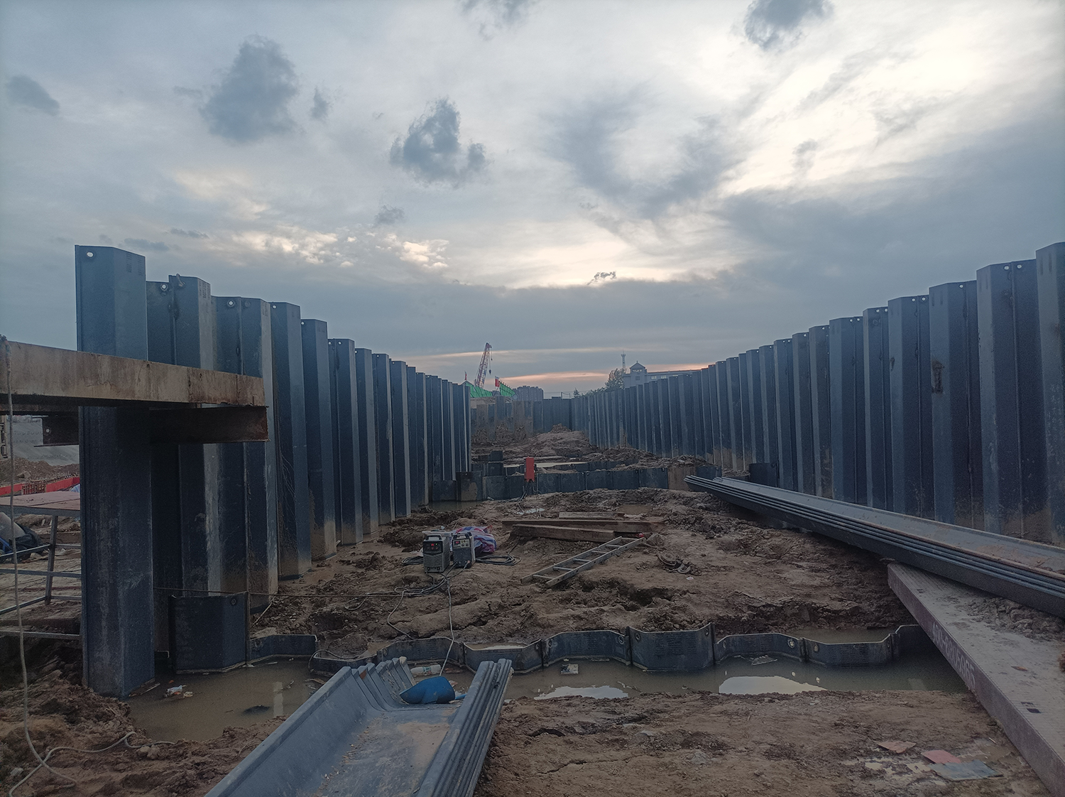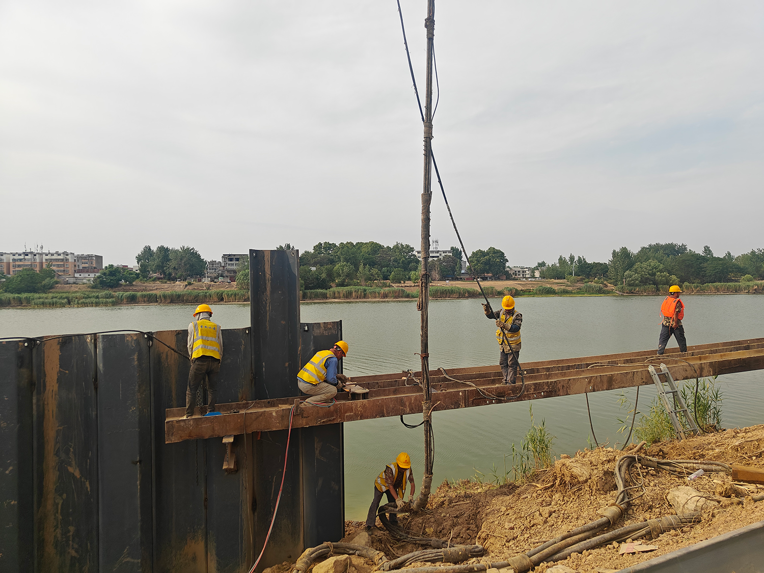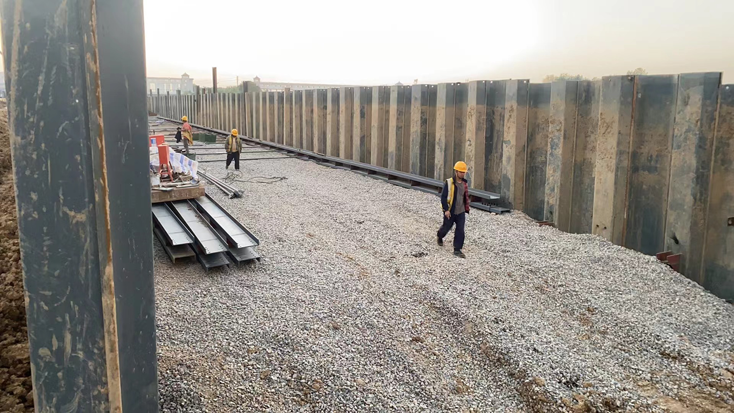 該隔流堤總長 321.5m,采用 PU750*225a 熱軋 U 型拉森鋼板樁構(gòu)造成雙排樁圍堰式永久性結(jié)構(gòu)的隔流堤,樁長為 24 米。鋼板樁作業(yè)區(qū)域1-10米為淤泥質(zhì)粉質(zhì)黏土、粉土等中軟土;約 12 米以下為粉質(zhì)黏土層,狀態(tài)較為密實(shí)。包含黏性土薄層、局部為粉砂或細(xì)沙,姜石含量為10%-15%。打樁阻力較大。